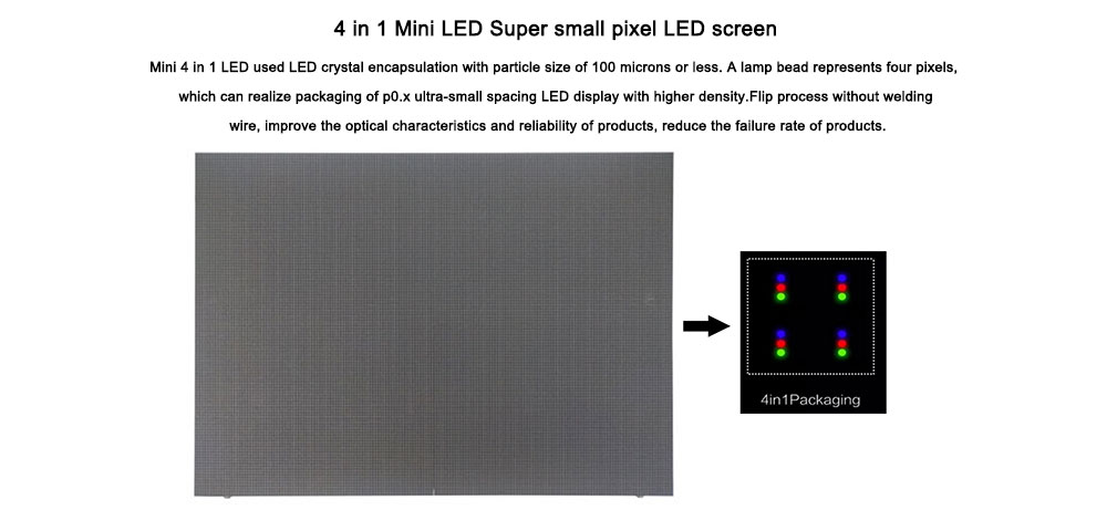 Το Mini 4 σε 1 LED χρησιμοποιεί τεχνολογία κρυσταλλικής κάψουλας LED με μέγεθος σωματιδίων 100 μικρόμετρα ή λιγότερο. Ένα σφαιρίδιο LED αντιπροσωπεύει τέσσερα pixel, επιτρέποντας τη συσκευασία LED οθονών P0.x με εξαιρετικά μικρή απόσταση και υψηλότερη πυκνότητα.
