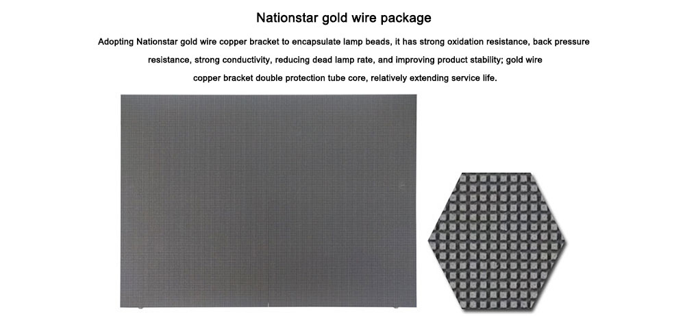 Η χρήση χρυσού σύρματος της Nationstar με βάση χαλκού για την κάλυψη των LED εξασφαλίζει ισχυρή αντοχή στην οξείδωση, αντοχή στην πίεση, υψηλή αγωγιμότητα, μείωση του ποσοστού καμένων LED και βελτίωση της σταθερότητας του προϊόντος. Ο διπλός προστατευτικός σωλήνας της βάσης χαλκού επιμηκύνει τη διάρκεια ζωής του προϊόντος.
